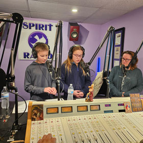 Selfies of listeners, guests and donators with life-like photo of St. Carlo Acutis who is known for creating Eucharistic Miracles of the World exhibit